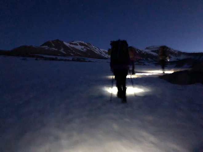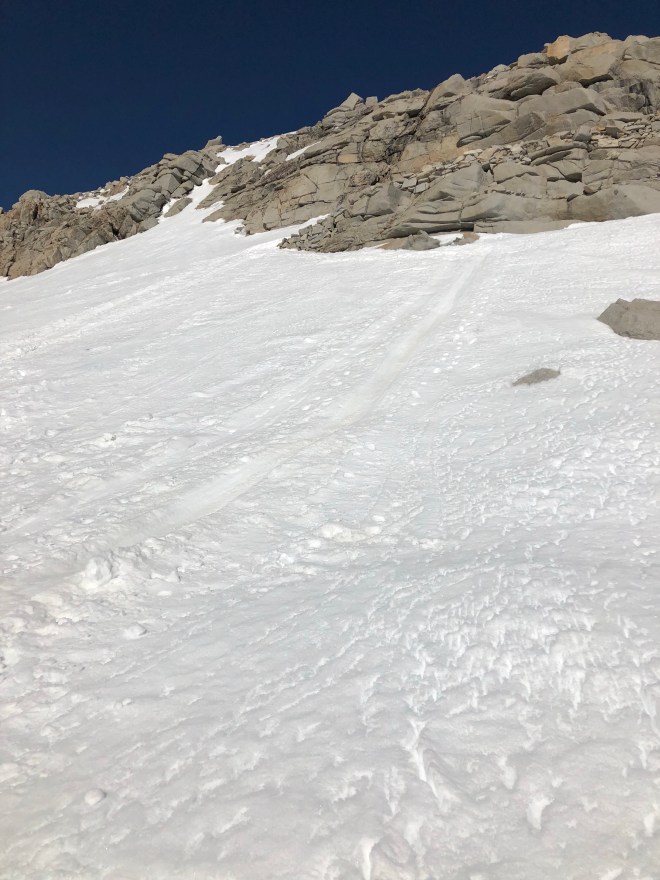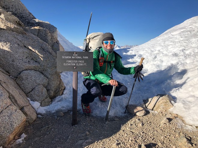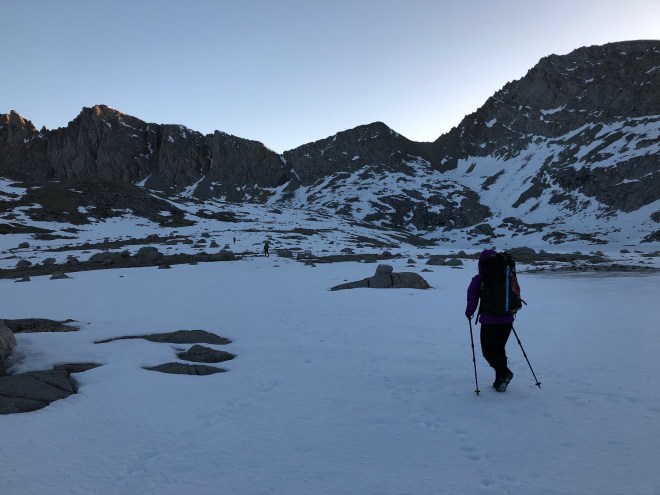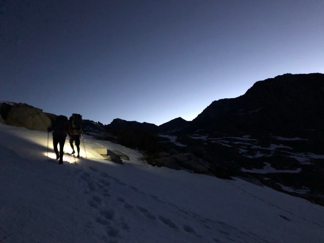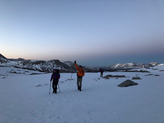 It was just after 4am when we were all ready to go–Andrew, Laura, Dude, Karma, and myself. Still dark, we headed up the trail with only the light of our small headlamps. It was cold, well below freezing. We were bundled up with nervous excitement of the next few miles that were to come. Within less than an hour of walking my water bottles on the side of my pack were practically frozen. It was around 515 for sunrise today which proved to be amazing with the mountain landscapes that lay before us. The main purpose of the day was to get up and over Forester Pass before the sun warmed and the snow became dangerously slushy. We pretty much walked on hard crusted snow for the next 2 hours. It was Slow going as we would occasionally lose the trail. What’s even more crazy the snow was so thick you could often hear the melting snow underneath where you walked.