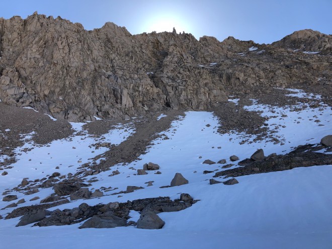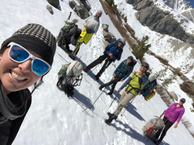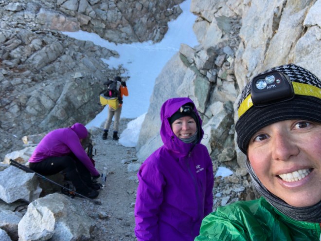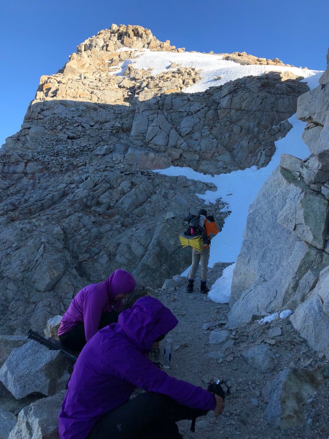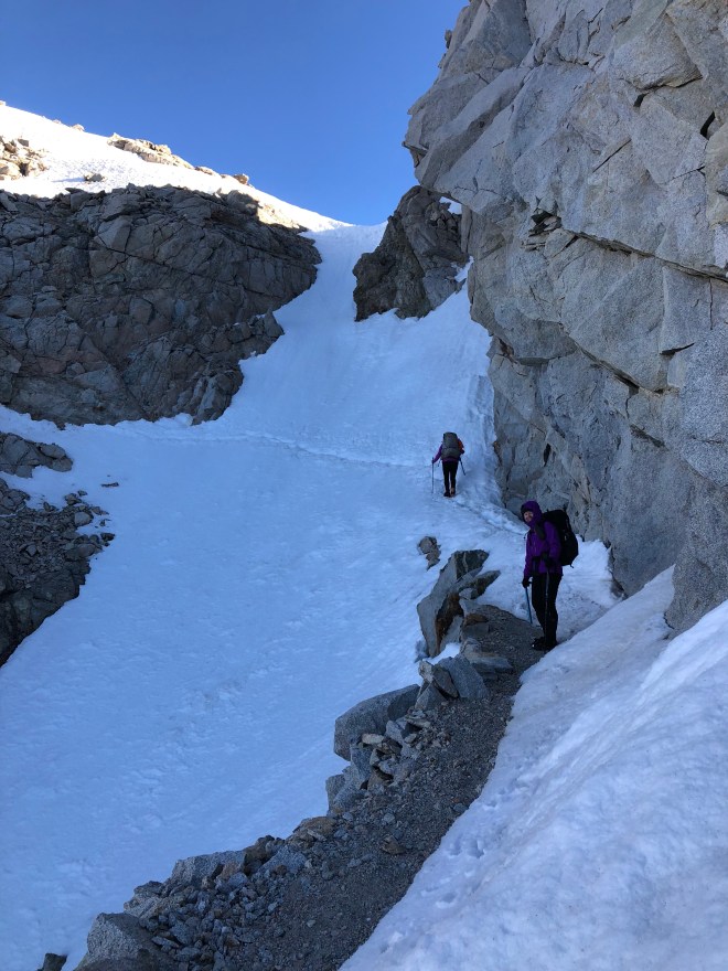 By 6am we started the approach–this is where we all had to stop taking photos. The crampons, microspikes and crampons came out and it was game on. I’ve never done anything like this. Laura and Andrew gave me some pointers on the ice ax and helped cut steps for me when they could as they had crampons and I had spikes. We went up the steep switchbacks for about an hour–somewhere in there we were able to climb a few hundred feet without the footgear but it was still steep. When we reached the “chute” we put the footgear back on and this is where it got a little hairy. Dude went across first. That crazy guy never even broke out his ax. Andrew was second and then coached us girls all the way across. It was steep and icy and something you just didn’t want to look down from. But sooooo exhilarating when you were across. There was one smaller straight up climb from there where I literally had to use my ice ax as a handheld to get me up and over the top. And when I did… I wanted to cry. Both sides of the mountains were spectacular!!! And to realize you’ve climbed something that most people will never do is simply overwhelming. I’ve already heard stories of people looking at Forester Pass and turning back around. I was pretty impressed with all of us today.