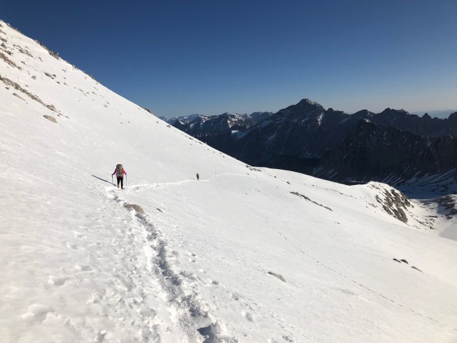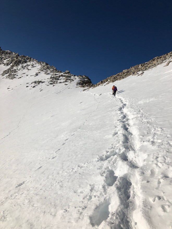 Once on top we took the obligatory photos. How could you not. From there the sun was already working it’s magic and the back side of Forester was soft and fluffy. After about an hour of cutting steps we found our first glissade. Super fun!!!! Nothing like sliding down the side of a frozen mountain. We had a little snack break there, I hadn’t eaten a thing all morning and I was starved. (Side bar: the granola bar I left in my pocket for the walk up was frozen by the time I reached for it as were my ShotBloks.) While we were on break we could see a few other hikers just reaching the top of Forester. It was just about an hour later that I would turn around and see Luc plowing through the snow behind me. What a freaking surprise! (Side bar: he was camped 1 mile behind us 2 nights ago, and we thought he woke up early and passed us. Well, that was not the case. Even tho Dude and I didn’t leave that spot until 9 yesterday, Luc didn’t leave his spot til 11am. Very unlike him but funny how it all worked out.)