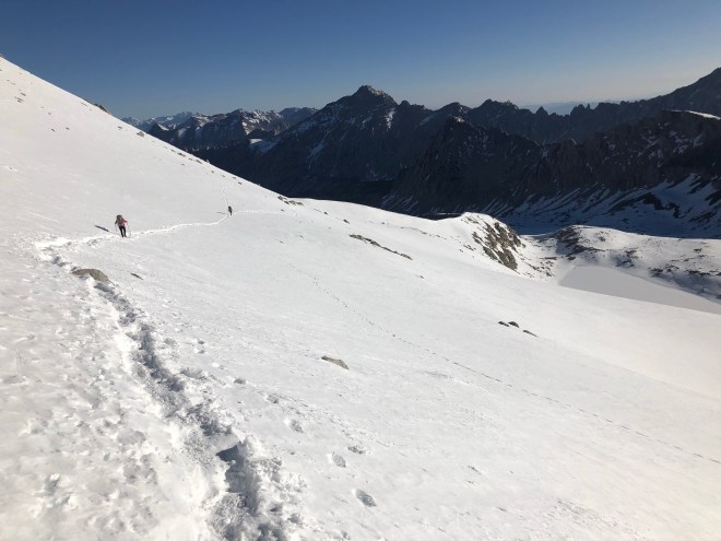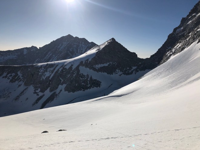 After the crossing we found Bible. Luc had been hiking with him before Kennedy Meadows so they were happy to reconnect. And now we were a party of 7. As the rest of the miles ticked by, it was 1pm by the time we took the steep side trail to Bullfrog Lake and Kearsarge Pass. From where we are currently camped it’s 2 miles up the Pass and 4.4 back down the other side. Snow covered as well so we will be doing some of the same things we did this morning. Although we won’t be starting out at 4am again. Once over Kearsarge Pass tomorrow we will hitch into Independance where we will resupply. I may have to go into Bishop as my microspike are too small for my shoes and horribly uncomfortable once I’m going down anything steep. And I also broke a tip off my trekking poles and my new tips won’t be on the trail until next week–poor planning on my part of the resupply system.