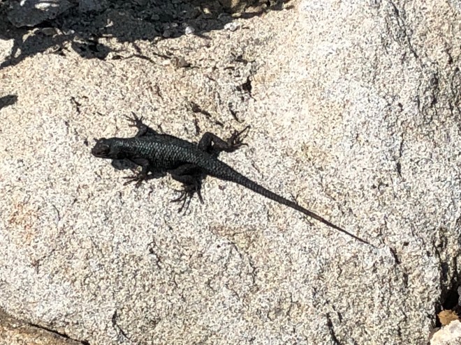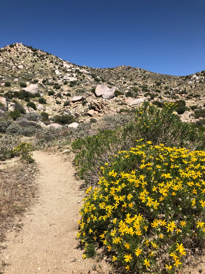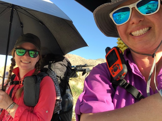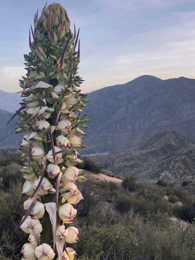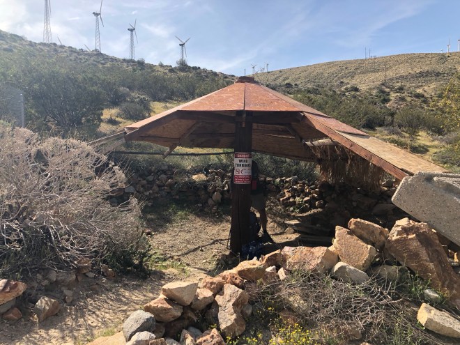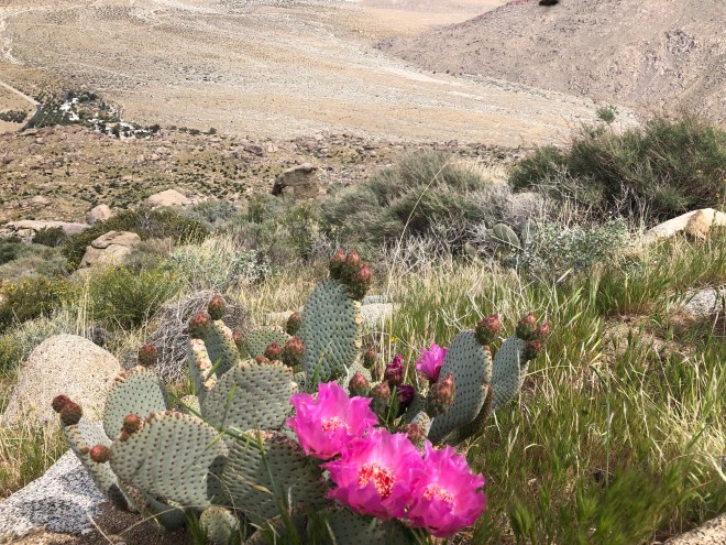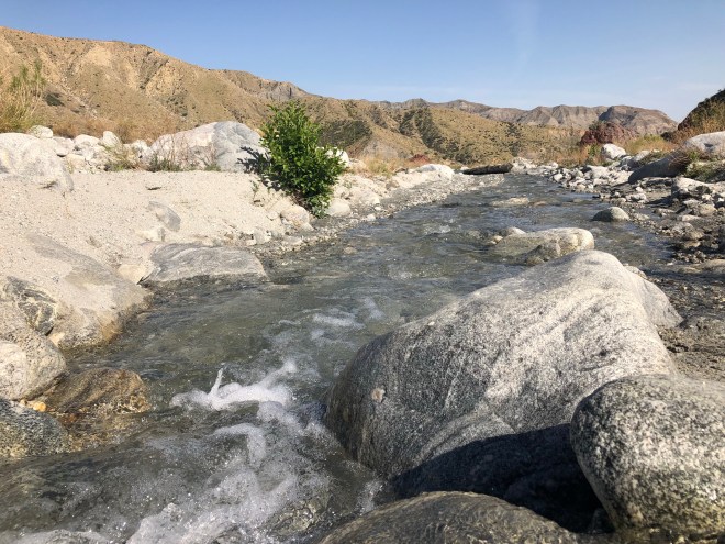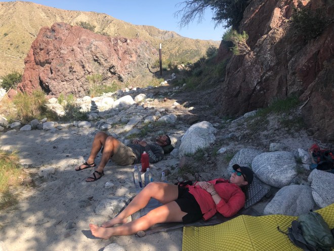 We were hiking before 8am and it was already 85 degrees out. We knew we had 11 miles to hike before we’d get to Whitewater River. We made a quick soda stop ($1 for a cream soda and it was delish) at the Mesa Wind Farm where they have a little hiker shade patio outside–complete with free water and wifi. The plan from Mesa was to make it to the river, rest, and then resume hiking once the temperature started to drop in the afternoon. The hike up was tough but beautiful, so many wildflowers and cacti in bloom. Saw a big horn sheep and a few lizards of course.
