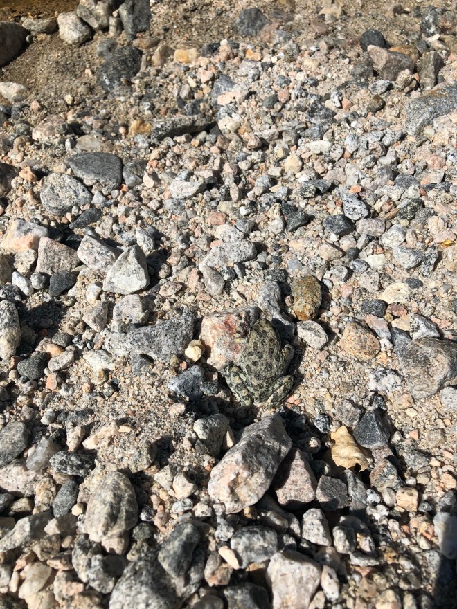 Oh yeah, even tho we camped right by the creek last night and the frogs were croaking all night, I finally saw one today after our second break. I almost stepped on him. Cute little thing. You can barely see him in this photo.
