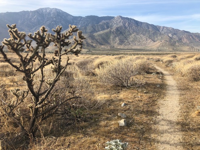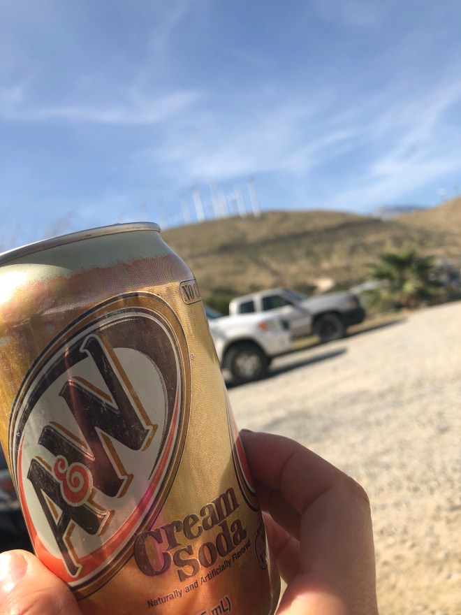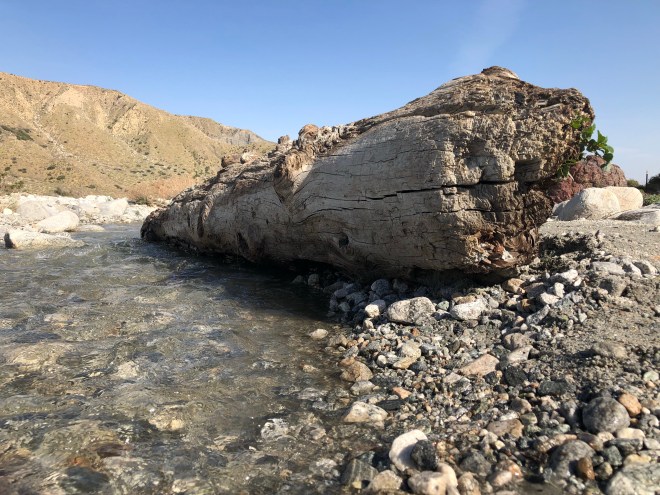 We were hiking before 8am and it was already 85 degrees out. We knew we had 11 miles to hike before we’d get to Whitewater River. We made a quick soda stop ($1 for a cream soda and it was delish) at the Mesa Wind Farm where they have a little hiker shade patio outside–complete with free water and wifi. The plan from Mesa was to make it to the river, rest, and then resume hiking once the temperature started to drop in the afternoon. The hike up was tough but beautiful, so many wildflowers and cacti in bloom. Saw a big horn sheep and a few lizards of course.