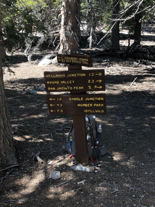 Getting back to the trail was exciting today. It felt new again but that sure didn’t last long. Our first task was to get back to the PCT via a side trail where we were dropped off. The Humber Park trailhead is the easiest start point in Idyllwild. Unfortunately it’s not an easy trail. The starting elevation was 6,479 ft. We climbed to the saddle junction at 8,114 ft. And then climbed to 8,992ft where you could take option A and stay on the PCT or be an overachiever and summit Mt. San Jacinto 10,834ft. I’d love to tell you how beautiful the summit view was… but I can’t. Laura and I stayed on the PCT while Justin went to the summit. I figured I didn’t need to kill my legs first day back on the trail and Laura agreed. There’s always time to climb that peak.