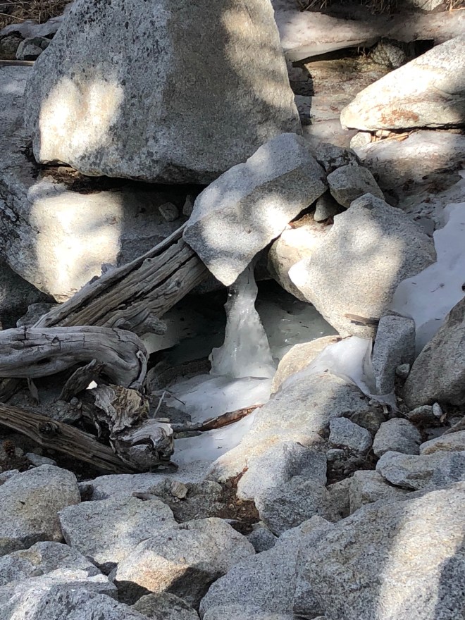 We saw our first bit of snow today. That is, leftover snow. Just little bits here and there. Fuller Ridge, which is what we descended prior to our camp spot has been known to be covered in snow early in the hiking season. Today, it was beautiful and sunny. I did hear a few Hikers were up on San Jacinto yesterday and had to descend as there was hail and rain. I have yet to talk with Emily and Dani as they could have potentially been part of that experience.