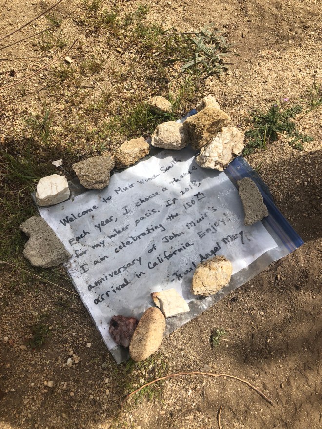 Once we got going we knew we were headed to Mile 151 for our pickup ride to Paradise Valley Cafe. We luckily had 2 water sources today, one of which was a cache another which was on private property of a trail angel named Mary. The water cache had been well stocked last on the 30th of March and was almost empty today as I took one liter to get me to Mary’s Place. At Mary’s, which was mile 145, she had just dropped off a large jug of ice cold lemonade. Her little hiker oasis was pretty cool. It was complete with tent spots, a water tank, benches underneath a canopy and a makeshift portapotty and shower. I rinsed my head off as I could feel how matted my hair had been for the past few days. The simple things can fee so good.