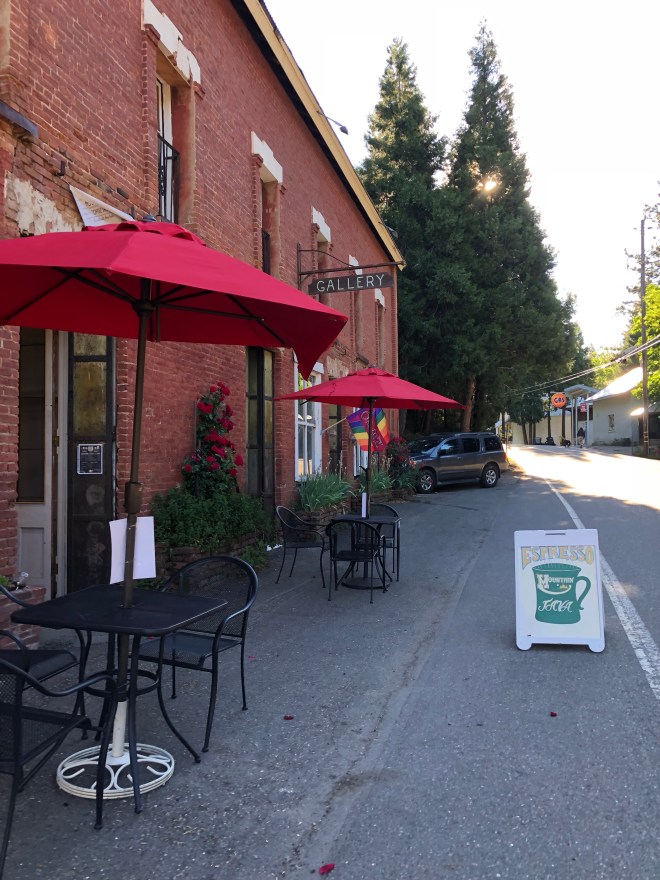 When I was done packing, I walked over to the Country Store one more time to use their WiFi. I waited there until the coffee shop opened at 730. I had noticed that the coffee shop had some really cool steel doors. When I ordered the barista told me the building used to be an old Wells Fargo bank–not sure if you can see them in the photo.