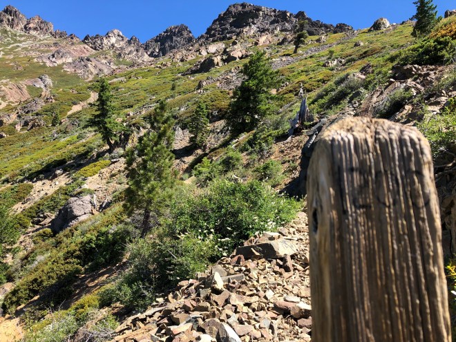 I finished my coffee and walked the 1.5 miles back uphill to the trail head. Sierra City elevation was 4182, the trailhead was at 4576 and I knew I had a few miles to grind to start…. all the way back up to 7193–in about 6 miles. It was a long hot climb. Nothing really felt great today. My knees were the worst. Everything just felt sluggish. RacerX and Dan caught up to me when I took my first lunch break. They were talking about doing 25-30 miles today. I pretty much told them I wasn’t going to make 20 miles for sure. So we chatted and I let them go about their fast-paced walk.