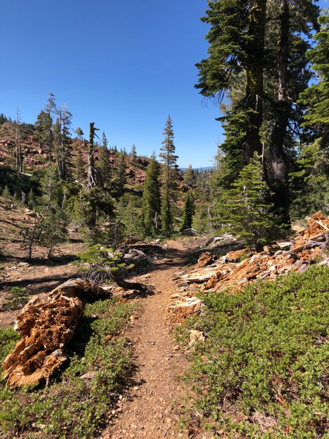Once back on the “new PCT” I took a tumble. The trail around Tamarack Lake isn’t quite worn in and some of the bushes have only been partly cut back. I managed to perfectly kick a branch or root sticking out into the trail and before I knew it, BLAM! I was laying in the bushes. I think my knees took the brunt of the fall as I have a few new scrapes on them. Somehow I landed face up, with my pack in the bushes providing comfort. Other than that, I was a little dusty but everything else was in tact. Seriously, it was not my day today.