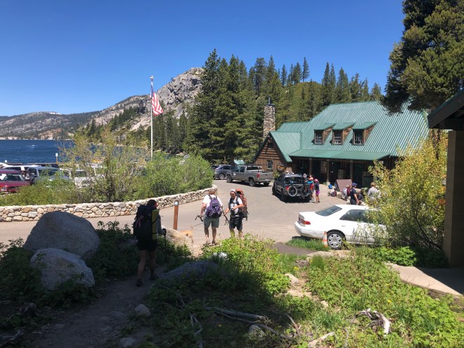 When I got to South Lake off the SouthTahoe Airport shuttle, I had a box of food that I had checked in my hands and my backpack. The checked box also contained my campstove and knife and a few other things I couldn’t carryon on the plane. I walked half a mile and found a JambaJuice where I could loiter at and rearrange all the stuff in my pack. This place is packed with tourists, not hikers, and so I got a lot of weird looks as to what I was doing.