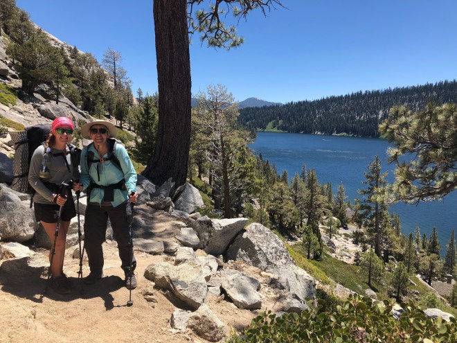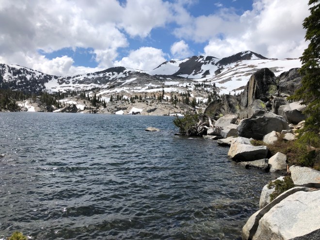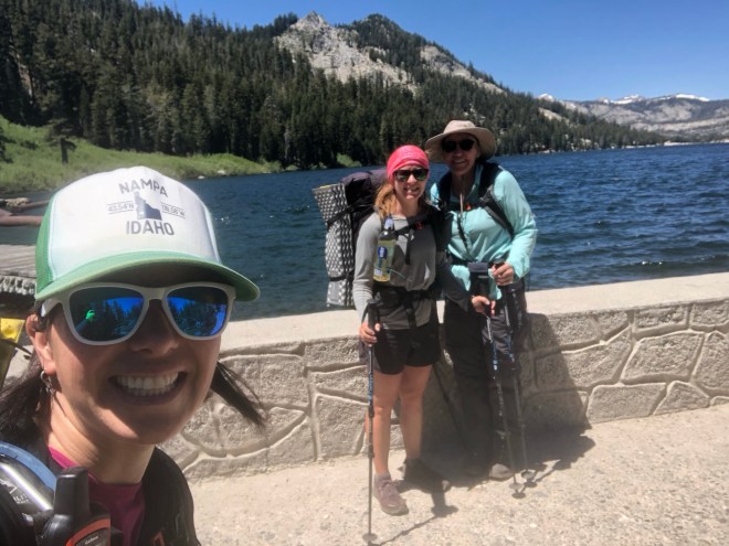 Breakfast this morning was included with the stay at the Fireside Lodge. A cute bed and breakfast place for sure! After breakfast, Debbie was kind enough to run me into Big 5 where I could pickup some fuel for my campstove. I also needed a lighter and a water bottle which I was able to find both at a grocery store. After that, we were off to the trailhead. We parked 1 mile south of Hwy 50–which was almost as dangerous as crossing a log. Debbie hiked 3.5 miles with us. We stopped for a snack break on the east side of Lower Echo Lake which is where she headed back to the car. It was really nice to meet her!!! Thank you so much for letting me stay the night with you and Laura and for the quick errands this morning! Hope to see you again soon.