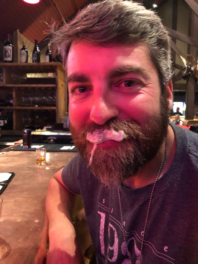 We were happy to welcome into our room for a shower and some leftover pizza–which he ate WITH olives. Then we went for some real dinner at the Mammoth Tavern.